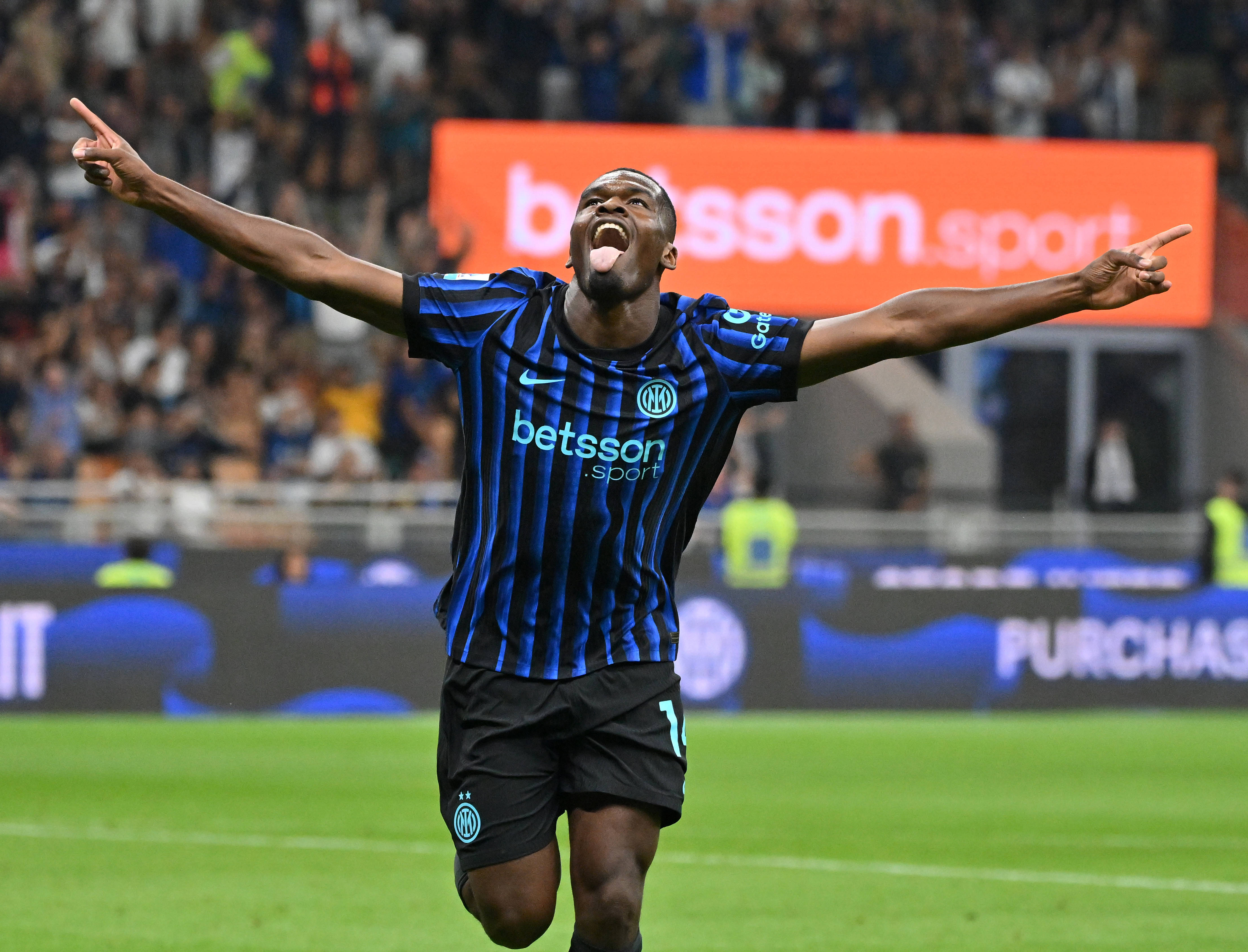 8月25日,国际米兰队球员图拉姆庆祝进球。 新华社发(阿尔贝托·林格利亚摄)